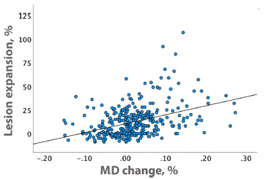- Expanding vs Stable Lesions: Of 361 lesions analyzed, 104 showed expansion while 257 remained stable, demonstrating distinct patterns of tissue damage
