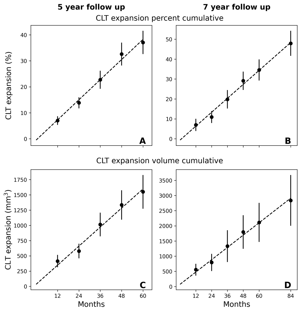 - Brain volume decreased by approximately 2% over the 5-year study period, showing continued atrophy despite treatment