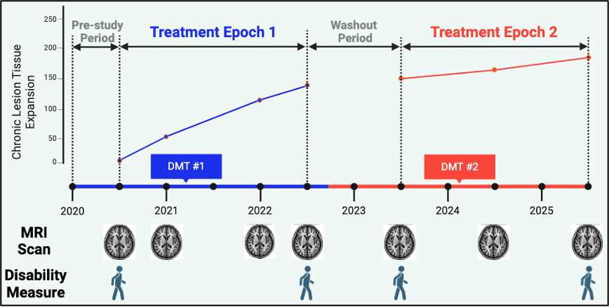 We propose a world-first international investigator-led retrospective cohort study Comparing Outcomes of Multiple Pharmacotherapies on Active Smouldering Sites in MS (COMPASS-MS). The study will evaluate the comparative effect of current DMTs on the reduction of smouldering inflammation in MS patients and will leverage our validated quantitative biomarker, Chronic Lesion Tissue Expansion (CLTE), measured through our innovative Lesion Expansion and Analysis Pipeline (LEAP).